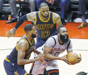当地时间3月12日,火箭队球员哈登(右)在比赛中突破骑士队球员汤普森(左)和詹姆斯的防守。当日,在2016~2017赛季NBA常规赛中,休斯敦火箭队主场以117∶112战胜克利夫兰骑士队。 新华社发