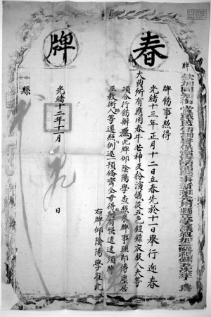 “牌”是清代地方官府向下行文的文书。光绪十二年的春牌,是南部县衙发给该县具体承办迎春大典的司仪人员,即阴阳学官(掌管阴阳学事务的衙门官吏)的。内容为:“照得光绪十三年正月十二日立春,先于十一日举行迎春大典。所有应用春牛、芒神及扮演仪从、五色铠靠衣服、人夫等项,合行饬办。为此牌仰阴阳学查照来牌事理,即传尘居、巫教术师(阴阳学管理的神职人员)人等,遵照向例逐一预备齐全,毋得临期有误。”承办人员接“牌”后,即按照“牌”的要求,办理落实相关事项。