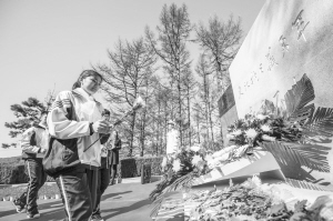 3月13日,学生代表在公祭活动现场向东北抗日义勇军纪念碑献花。