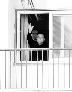 这张2015年5月4日拍摄的资料照片显示,在埃及首都开罗,埃及前总统穆巴拉克向其支持者挥手致意。新华社发