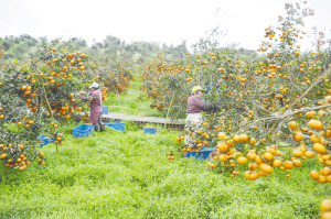 3月15日,果农在重庆长寿区双龙镇的现代农业种植园区内采摘晚熟柑橘。