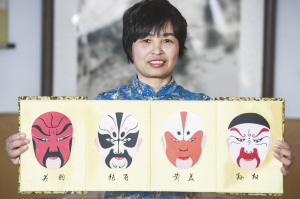 3月15日,任雪青展示布雕画《脸谱》。