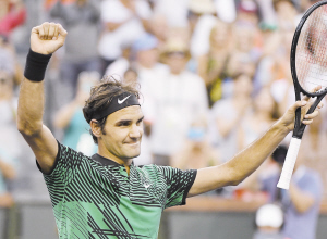 当地时间3月15日,费德勒庆祝获胜。当日,在2017年ATP1000系列赛印第安维尔斯大师赛单打1/8决赛中,瑞士选手费德勒以2∶0战胜西班牙选手纳达尔,晋级八强。新华社发