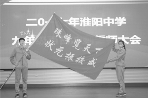 3月17日上午,淮阳中学举行中考百日冲刺誓师大会。会上,学生们观看了《河南省淮阳中学初中部百日冲刺特辑》,通过群体朗诵的形式分享了优秀学生代表的学习精神和学习经验。在接下来的100天里,淮阳中学校长高远征希望大家明确目标,科学安排,勇敢挑战,不畏艰难,团结拼搏,心往一处想,智往一处谋,劲往一处使,用汗水浇灌理想之花,用拼搏再续淮阳中学辉煌。图为该校中考出征的战旗。 记者 刘华志 摄