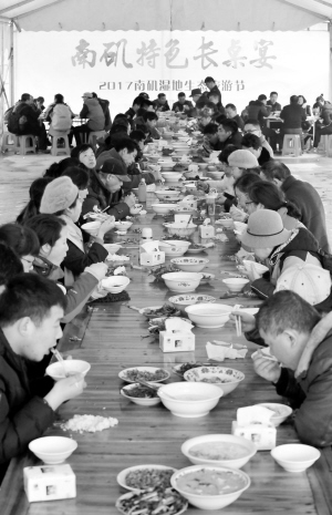 3月18日,游客们在南昌市新建区南矶乡百人长桌宴上品尝美食。