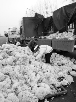 本报讯 3月17日,商周高速周口辖区内发生一起交通事故,一辆货车因为驾驶员犯困而侧翻,1万多斤蔬菜散落一地。