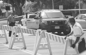 美国加利福尼亚州洛杉矶县天普市20日早晨发生一起枪击事件,一男子在警察局外与警方交火后死亡。新华社记者 杨磊 摄