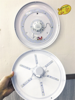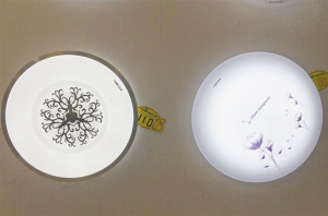 某家灯具店负责人向记者展示了LED灯光源不均匀的现象。记者看到,左边一款吸顶灯周边与中央的亮度一致,右边一款吸顶灯的中央亮,周边暗,形成一个“白月亮被黑圈包围”的景象。同时,右边这款吸顶灯的光源也不稳定,即出现了行业所称的“频闪”现象,眼睛看久了这样的光源容易疲劳或者有流泪的感觉。此类产品在低端市场中和网购产品中比较多见。