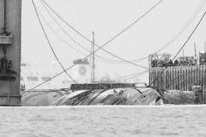 3月23日,在韩国珍岛郡附近海域,工作人员进行“岁月”号沉船打捞作业。