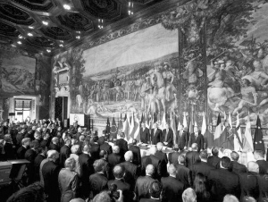 1957年3月25日,“欧洲煤钢联营”6个成员国(比利时、法国、联邦德国、意大利、荷兰和卢森堡)在罗马共同签署《欧洲经济共同体条约》和《欧洲原子能共同体条约》(二者统称《罗马条约》),自此迈出欧洲一体化进程关键一步,为建立今天的欧盟奠定了重要基础。