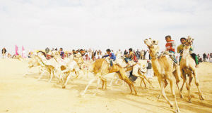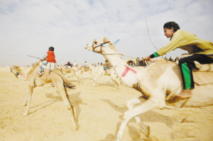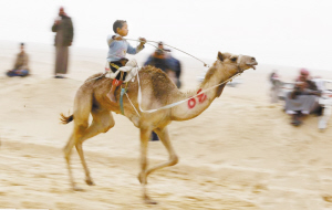 日前,国际骆驼大赛在埃及伊斯梅利亚举行,在伊斯梅利亚省的沙漠,小骑手骑着参赛骆驼向终点冲刺。