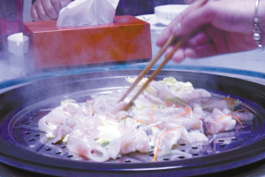 其特色佳肴当属脆皖鱼,这种产自广东的鱼,在清澈的沟渠中,用蚕豆引诱逆水而行喂大的鱼,鱼肉新鲜,爽脆,营养丰富,哪怕用锅蒸出来,鱼肉口感如初,全然没有北方鱼的腥土味,消费者很是喜爱。另外,海鲜、蔬菜等皆可以蒸食,配上不同口味的佐料,更是美不胜收。