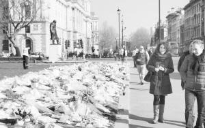 3月28日,在英国伦敦,人们经过议会广场草坪上摆放的悼念恐怖袭击遇难者的鲜花。
