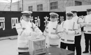 何涛等民警了解情况后,在依法对杨彦灵进行处罚后,又于次日下午组织30多名执法人员,在郸城县胡集乡张大庄交通运输局超载车辆卸载点开展爱心募捐活动(如图)。随后,他们又驱车来到杨彦灵家中,把2050元爱心捐款交给杨彦灵。杨彦灵接过爱心捐款,既羞愧又感动,连声感谢大家的帮助。