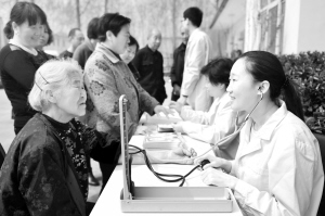 当日,河北省邢台市经济开发区第一医院组织医务志愿者走进南市屯社区开展义诊活动,为社区居民免费检查身体,宣传卫生健康知识。新华社记者 朱旭东 摄