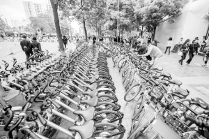 今年以来,摩拜、ofo、永安行等共享单车大量进驻昆明,在方便市民的同时,乱停乱放的问题也随之产生。针对此问题,昆明市城管等相关部门与企业合作,在城市各个主要公共场所、小区等地设置共享单车临时停放点,并安排专人规范车辆停放,目前全市已设置约120个共享单车临时停放点。新华社记者 胡超 摄