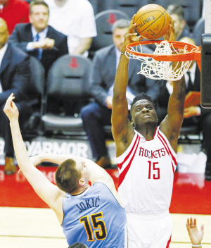 当地时间4月5日,火箭队球员卡佩拉(右)在比赛中扣篮。当日,在2016~2017赛季NBA常规赛中,休斯敦火箭队主场以110∶104战胜丹佛掘金队,从而锁定西部赛区第三。