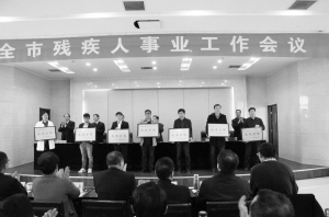 本报讯 4月7日,我市召开残疾人事业工作会议。会上,来自全市的14名残疾人创业模范及41个残疾人工作先进乡(镇、办事处)获得了表彰(如图)。