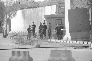4月12日,在阿富汗喀布尔,警察在爆炸现场附近警戒。