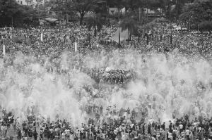 4月15日,人们在云南景洪市泼水广场上泼水狂欢。