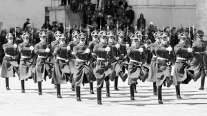 当日,俄罗斯总统警卫团在克林姆林宫举行了2017年度首次换岗仪式。莫斯科时间12时左右,俄罗斯总统警卫团步兵和骑兵仪仗队身着复古军礼服,在军乐队的伴奏下分别进行了枪械花式表演和马队分列式表演。新华社记者 白雪骐 摄