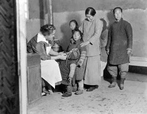 天津,洋大夫给中国儿童看病。