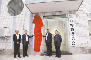 周口金融仲裁院于2016年10月19日正式挂牌成立。图为揭牌现场。(左一为金融仲裁院李士民院长,左二为周口银监分局赵其有局长。右二为周口市政府副秘书长、法制办及金融办主任冯干敏,右一为周口仲裁委员会秘书长赵其凯。)