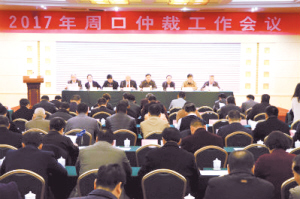 周口仲裁委员会工作会议于2017年3月9日在周口饭店召开。会议总结了2016年工作,安排部署了2017年的工作重点,对19个先进单位和22名先进个人进行了表彰。图为会议现场。
