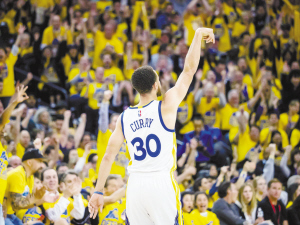 当地时间4月19日,勇士队球员库里庆祝投进三分球。当日,在2016~2017赛季NBA季后赛首轮第二场比赛中,金州勇士队主场以110∶81战胜波特兰开拓者队,大比分以2∶0领先。