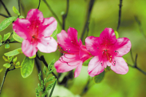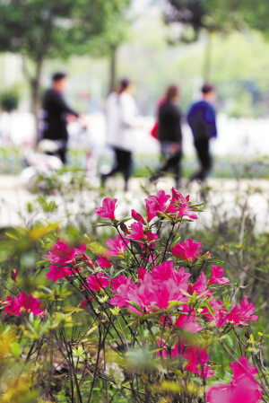 4月20日,周口晚报记者在周口师范学院校园里看到,正盛开的杜鹃花绚丽夺目,吸引了众多师生前来观赏拍照。晚报记者 金月全 摄