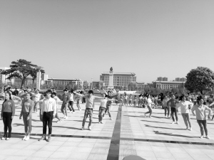 4月23日7时,团市委组织500多名青年志愿者在文昌大道和谐公园广场上演一场“快闪”。随着音乐响起,来自各行各业的500多名青年志愿者走到一起,唱歌、跳舞。一切都来得那么突然,让很多不知情的市民惊讶不已。据介绍,本次活动的主题是“青春喜迎十九大,不忘初心跟党走”。晚报记者 王凯 摄