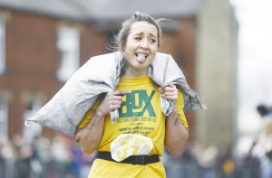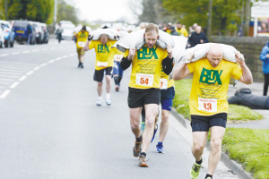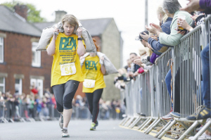 日前,英国约克郡戈索普,当地举行一年一度的世界扛煤锦标赛。男女选手扛起大袋媒一路奔跑至终点。