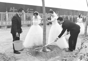 劳动节前夕,正在建设中的济青高铁中铁三局项目部邹平县建设工地的16对新人穿上婚纱,在自己平日工作的施工工地拍摄结婚照,并栽下象征永久幸福的合欢树,纪念人生中这一重要时刻。新华社发