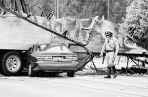 4月25日,一名巡警在美国洛杉矶车祸现场展开工作。