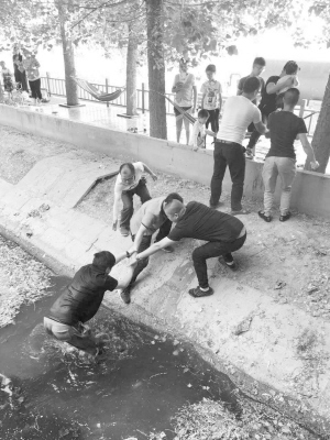 围观群众和孩子家长将小女孩拉上岸,魏江滨也在众人的帮助下顺利上了岸。
