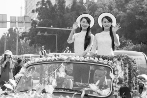 5月1日,一对双胞胎姐妹在云南墨江参加国际双胞胎节。