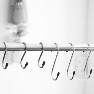 S形挂钩通常用于厨房挂杆上,方便吊挂各种厨房用具,也是大爷大妈们出门最爱携带的实用工具。坐公车和地铁时,将S形小挂钩挂在座位靠背、扶手等地方,可以吊挂随身携带的物品。这种挂钩与浴巾杆一起,也能组成完美的搭配。