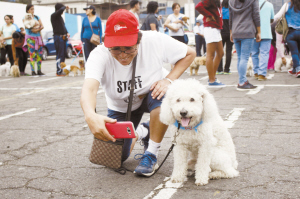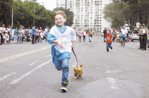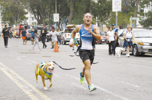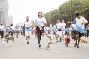 日前,在秘鲁首都利马举行了一场有宠物犬参加的马拉松赛,比赛中宠物主人带领宠物犬在1.5千米的道路上奔跑。