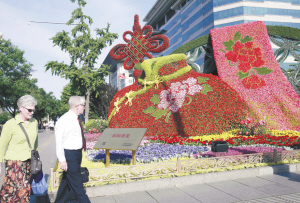 5月7日,行人从北京西单街头“和和美美”花坛前走过。