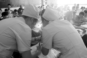 刷牙是横着刷还是竖着刷,刷多久才是最科学的,如何消除牙斑……5月9日上午,周口口腔医院的50多名医护人员来到文昌小学,为学生检查口腔卫生,讲解口腔健康知识,现场演示科学的刷牙方法。晚报记者 王凯 摄