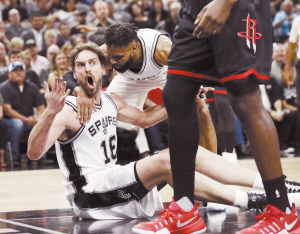 当地时间5月9日,马刺队球员保罗·加索尔(左)对判罚表示不满。当日,在2016~2017赛季NBA季后赛西部半决赛第五场比赛中,圣安东尼奥马刺队主场以110∶107战胜休斯敦火箭队,从而以3∶2的总比分暂时领先。