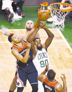 当日,凯尔特人队球员约翰逊(右二)与奇才队球员波特争抢。