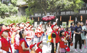 午餐结束后,小记者赶赴全国重点文物保护单位——花戏楼游览。花戏楼原名歌台,为古时候演戏用的舞台,因戏台上精致的杨木透雕和五颜六色的彩绘而得名。其上面雕刻有18出三国戏文,里里外外有600余个人物。在这里,小记者犹如穿越历史时空,仔细观察花戏楼建筑上色彩绚丽、美轮美奂的木雕和砖雕,听向导介绍动人的三国故事,了解到其砖雕是中国砖雕艺术历史上几千年演变的巅峰之作。