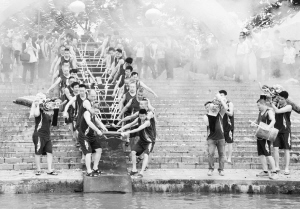 5月16日,在江西省赣州市水西镇章江江岸,龙舟队队员参加龙舟“顺水”仪式。