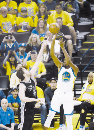 当地时间5月16日,勇士队球员杜兰特(右)在马刺队球员保罗·加索尔的防守下投篮。当日,在2016~2017赛季NBA季后赛西部决赛第二场比赛中,金州勇士队主场以136∶100战胜圣安东尼奥马刺队,从而以2∶0的总比分暂时领先。新华社记者 王迎 摄