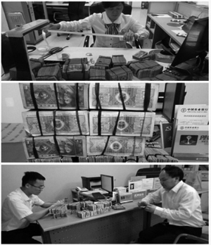 大堂经理在了解了基本情况后,迅速将此事报告给网点负责人。负责人立即启动柜台资源被占用的紧急预案,安排客户经理等后台人员及不当班的柜员开设弹性窗口进行清点(如图)。经过加班加点地清点,终于将整整一化肥袋的一角纸币清点完毕并存入农行账户,共计11200元,客户感动得连声称谢。