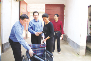 本报讯 日前,扶沟县检察院党组书记、代检察长苏宏锦带领该院领导班子成员和帮扶干警来到该县古城乡大王村,给有残疾的贫困户送来16辆爱心轮椅,让这些弱势群体感受到检察院的关爱和温暖(如图)。苏宏锦代检察长表示,关爱和帮助贫困户是检察院扶贫驻村工作的责任。今后,扶沟县检察院将从关注民生、体察民情、反映民意、共谋发展的角度出发,真正从群众最关心、最迫切的问题入手,真心实意地为群众办实事解难题,以务实的作风、扎实的工作打赢这场脱贫攻坚战。