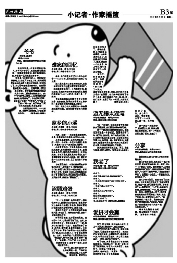 第二天,任务总算完成了。老师却严肃地告诉我们:“你们带了一天鸡蛋就觉得又烦又累,试想,你们哪个不是父母的‘宝贝蛋’,他们含辛茹苦带了你们十多年,每天照顾你们吃、喝、拉、撒,他们说苦、说累了吗?一时间,大家都沉默了……(辅导老师:许红)