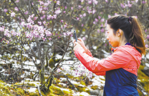 5月21日,游客在阿尔山市白狼镇白狼峰景区拍摄杜鹃花。