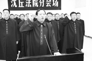 “忠于中华人民共和国宪法,维护宪法权威,履行法定职责,忠于祖国、忠于人民,恪尽职守……” 近日,沈丘法院38名员额法官在院党组书记、代院长赵振勇(中)的带领下,面向国旗庄严宣誓。
